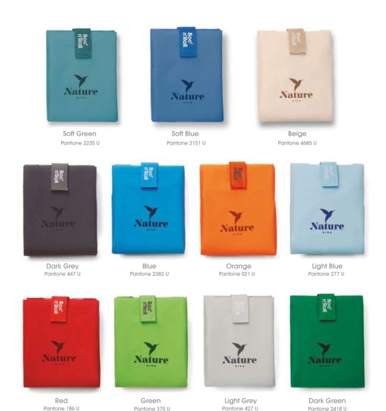 • Stoff in 5 Standardfarben: blau (PMS 301 U), orange (PMS 021 U), Schwarz (PMS Process Black U), grün (PMS 375 U) und rot (PMS 186 U)